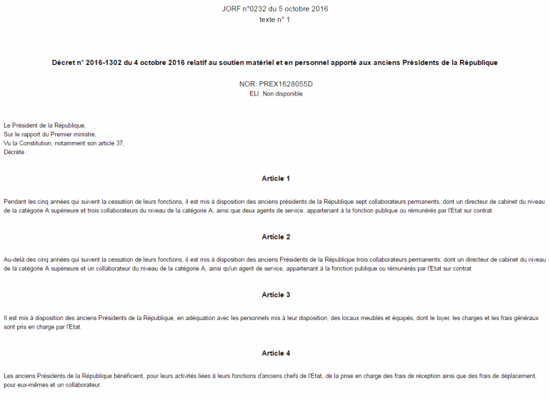 Le décret du 5 octobre 2016 relatif au soutien matériel et en personnel apporté aux anciens présidents de la République.