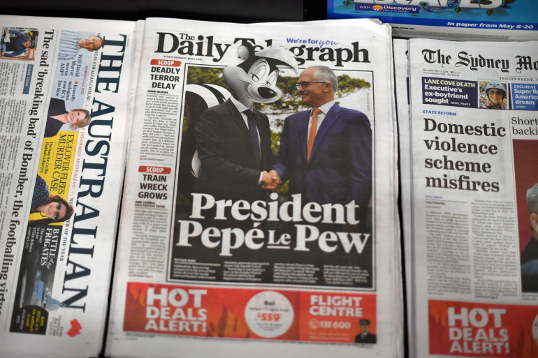 En photo avec le Premier ministre australien Malcolm Turnbull, son visage a été remplacé par celui de Pépé le Putois (Pepé Le Pew en version originale). "Cela m'a beaucoup fait rire", a confié Emmanuel Macron à la presse avant de quitter le pays, "d’autant plus que, dans le dessin animé, ce personnage a un accent français".