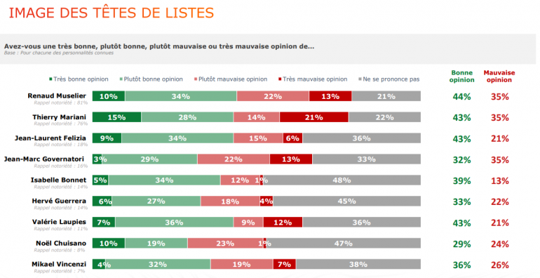 En effet, la liste RN de Thierry Mariani recueillerait 42% des voix, contre 33% pour la liste LR, UDI, Modem, Agri, LaREM menée par le président de la région PACA, Renaud Muselier. En effet, si ce dernier bénéficie d'une notoriété élevée, 81% des habitants de la région le connaissent, son image est en demi-teinte : 44% de ceux qui le connaissent déclarent avoir une bonne opinion de lui, 35% déclarent en avoir une mauvaise et 21% ne se prononcent pas.