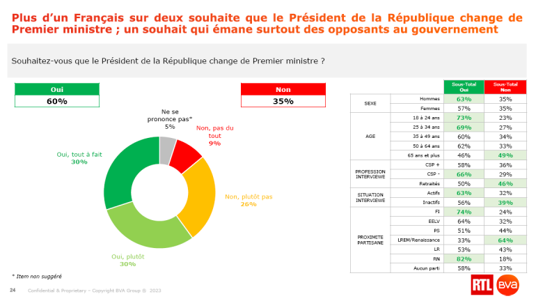 Ce souhait est particulièrement marqué chez les sympathisant de la France insoumise et du Rassemblement national à plus de 75%. Du côté des électeurs Renaissance, 4 électeurs sur 10 seulement souhaitent qu'Emmanuel Macron change son gouvernement. En cas de remaniement en revanche, les Français sont plus divisés sur l'identité du futur Premier ministre. Seuls 44% d'entre eux souhaitent qu'une personnalité de la droite pose ses valises rue de Varenne. C'est pourtant la proposition portée par plusieurs proches du président. L'hypothèse d'un remaniement ne fait aujourd'hui plus beaucoup de doute. Mais reste à savoir sa date et surtout son ampleur.