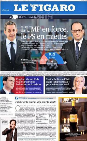 23h05 - "L'UMP en force, le PS en miettes" à la une du Figaro daté du 30 mars 2015.