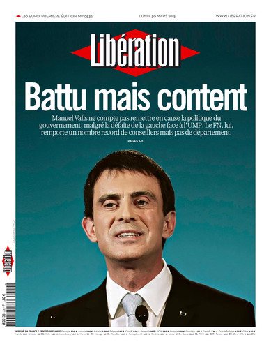 23h02 - Manuel Valls sera à la une de Libération daté du 30 mars 2015 sous le titre "Battu mais content". Le quotidien ironise sur la défaite de la gauche qui ne va pas entraîner de "remise en cause de la politique du gouvernement.