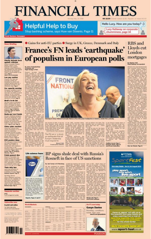 Le Financial Times fait sa une du lundi 26 mai sur Marine Le Pen "Le FN français a provoqué un séisme populiste dans les urnes européennes."