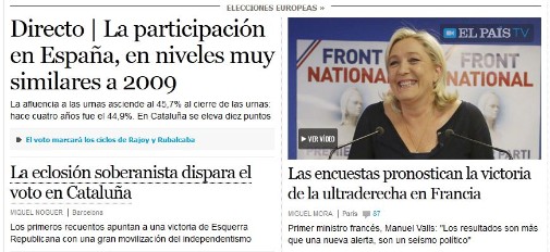 El pais commence son article en parlant des premières "estimations qui ont amplifié le pire scénario possible". "Marine Le Pen a gagné la première victoire à l'échelle nationale de son parti avec un discours renouvelé patriote xénophobe et populiste".
