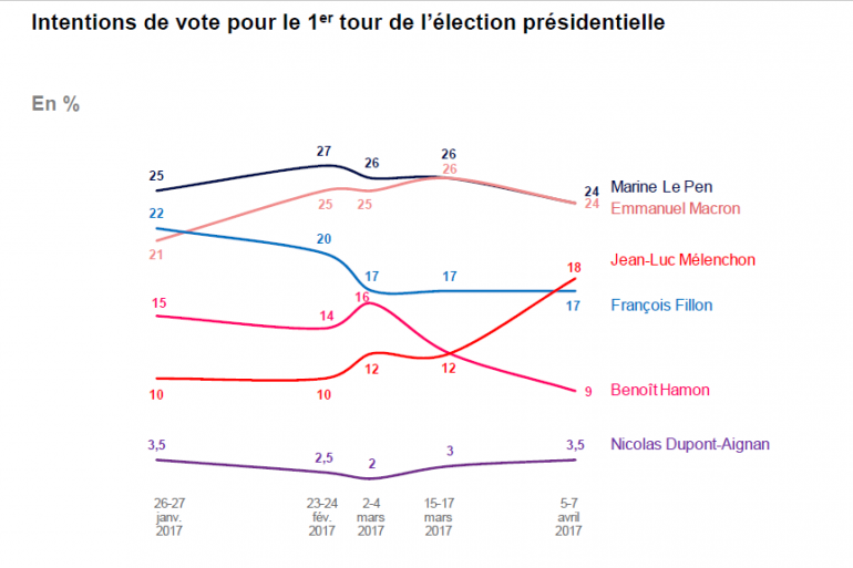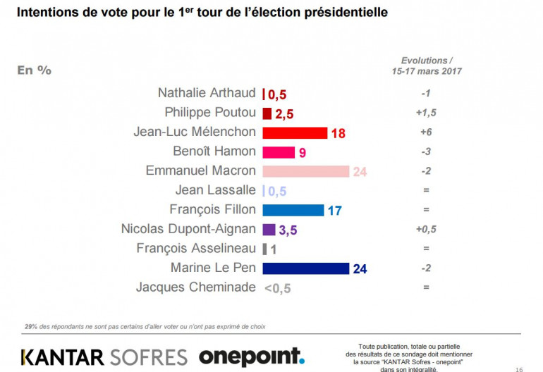 Selon une enquête Kantar Sofres-Onepoint pour le Figaro, RTL et LCI, Jean-Luc Mélenchon, le candidat de la France insoumise dépasse désormais François Fillon dans les intentions de vote avec 18% soit une hausse de six points en trois semaines. Il dépasse donc d'un point le candidat les Républicains qui stagne à 17%. Le sondage donne Emmanuel Macron et Marine Le Pen "toujours en tête du 1er tour et au coude-à-coude avec 24% des voix, tous deux en léger recul (-2 pts chacun)".