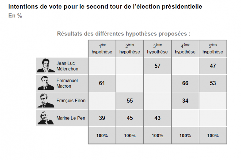 Toutefois, compte tenu de la part d’électeurs encore indécis et des mouvements possibles des électorats, d’autres hypothèses de seconds tours ont été élaborés dans le cas où l’un des deux favoris actuels du 1er tour n’étaient pas présents. "Si Emmanuel Macron ne se qualifiait pas pour le 2nd tour et que celui-ci voyait s’opposer François Fillon et Marine Le Pen, le candidat Les Républicains l’emporterait également mais avec 55% des voix". Face à Marine Le Pen, Jean-Luc Mélenchon obtiendrait un score plus élevé avec 57% des voix, en bénéficiant d’un bien meilleur report des électeurs de Benoît Hamon et d’Emmanuel Macron du 1er tour.