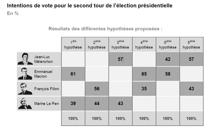 À noter que Marine Le Pen serait battue dans toutes les configurations au second tour. Face à Emmanuel Macron mais également face à François Fillon et Jean-Luc Mélenchon. En cas de surprise, avec un second tour entre François Fillon et Jean-Luc Mélenchon, ce dernier l'emporterait avec 57% des intentions de vote.
