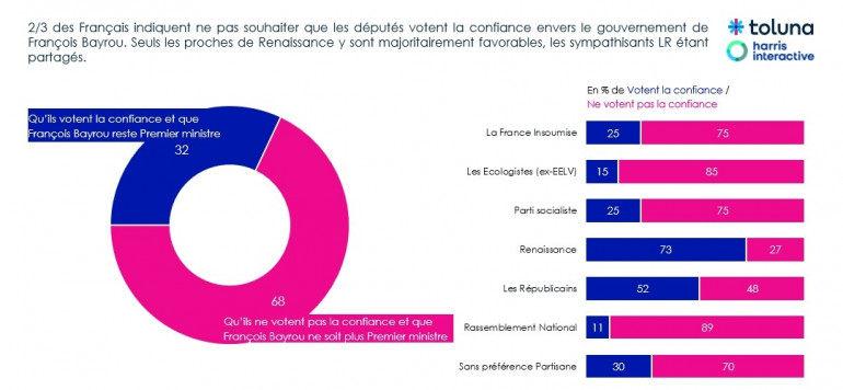 Dans le détail, cette opposition est partagée par une large majorité de sympathisants RN (89%), écologistes (85%), LFI et PS (75%). Seuls les proches de Renaissance sont en faveur de la confiance (73%), les partisans Les Républicains étant divisés sur la question (52% pour, 48% contre).