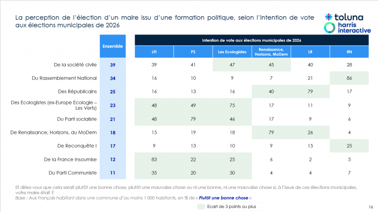 Pour ces élections, l'étiquette politique des candidats n'apparaît pas comme une variable discriminante. L’élection d’un maire issu de la société civile serait l’issue la plus positive aux yeux d’une majorité relative de Français. Si aucune formation politique n’est majoritairement perçue positivement par les Français, 1/3 d’entre eux verraient comme une bonne chose l’élection d’un maire du Rassemblement National.