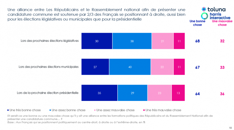 Même question concernant une candidature Les Républicains : 58% des Français interrogés sympathisants de droite et d'extrême droite y sont favorables, contre 42% qui pensent que c'est une mauvaise idée. Dans l'hypothèse d'une candidature commune portée par un ou une candidate Reconquête, ils sont 44% à estimer que ce serait une bonne chose, contre 56% à penser que ce serait une mauvaise stratégie.
