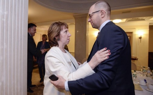Arseni Iatseniouk (à droite) est l'un des principaux opposants ukrainiens, avec Catherine Ashton, en en photo avec la chef de la diplomatie européenne Catherine Ashton (à gauche)