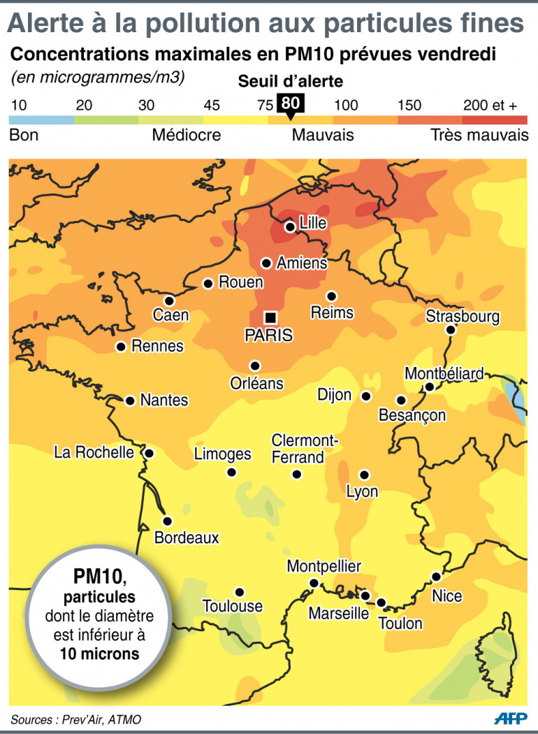 Le niveau d'alerte était dépassé jeudi dans plus de 30 départements: en Bretagne, Haute-Normandie, Calvados et Manche, dans une partie de Poitou-Charentes (Deux-Sèvres, Charente-Maritime), dans la majorité de la région Centre (Eure-et-Loir, Indre-et-Loire, Loir-et-Cher et le Loiret) mais aussi dans le Nord-Pas-de-Calais, la Picardie, la Marne, l'Ile-de-France, la région Rhône-Alpes et le Vaucluse. Cet épisode de pollution aux PM10 (particules inférieures à 10 micromètres), poussières de compositions diverses (chauffage au bois et au fioul, industrie, moteurs surtout diesel en ville), est favorisé par des conditions anticycloniques et des nuits froides suivies de journées bien plus chaudes, ne permettant pas la dispersion des polluants.