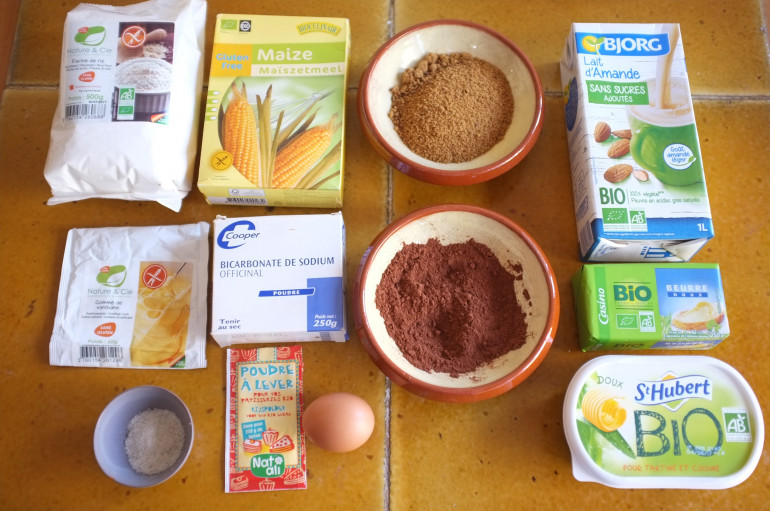 Préchauffer le four le four à 175°C. Préparer 1 plaque de cuisson, recouvert de papier cuisson. Dans un grand bol, mélanger la farine, la fécule, la gomme xanthane, bicarbonate, poudre à lever, sel, cacao et sucre. Bien mélanger avec un fouet et s’assurer que les grumeaux du sucre complet sont bien écrasés.