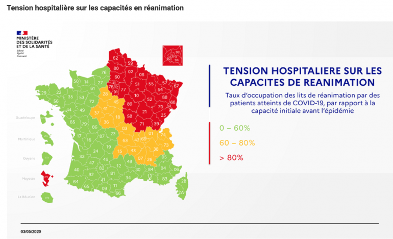 Parallèlement, une seconde carte dresse l'état des lieux des services de réanimation. Cette "tension hospitalière" est mesurée par le "taux d'occupation des lits de réanimation par des atteints de Covid-19, par rapport à la capacité initiale avant l'épidémie".