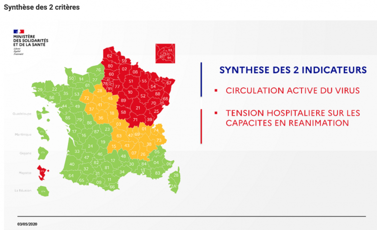 Car, le ministère de la Santé publie chaque jour, non pas une, mais deux cartes de déconfinement, répondant chacune à des critères distincts : l'état de l'épidémie et celui des services de réanimation. Une troisième carte, faisant la synthèse des deux indicateurs, est également diffusée quotidiennement par les autorités sanitaires.