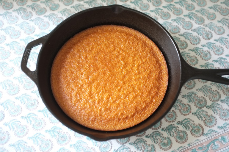 Si vous n’avez pas de poêle en fonte, utilisez un moule (par exemple, carré d’environ 20cm). Après cuisson, laissez reposez 10mn dans le moule, puis inversez la face du pain dans le moule et laissez reposez encore 10mn, cela permet d’obtenir une belle texture croustillante ressemblante à celle obtenue par la fonte).