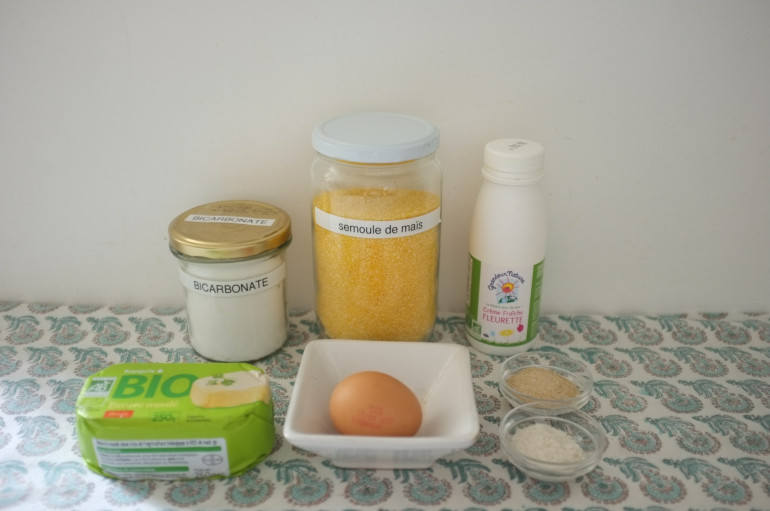 Préchauffez le four à 215°C. Mettre le beurre en cube dans la poêle en fonte et enfourner jusqu’à ce que le beurre soit fondu, environ 4mn. Pendant ce temps, mélanger ensemble, dans un bol moyen, les ingrédients secs : la semoule de maïs, le sucre, le bicarbonate et le sel. Dans un saladier, mélanger ensemble les ingrédients humides : l’œuf et la crème fleurette.