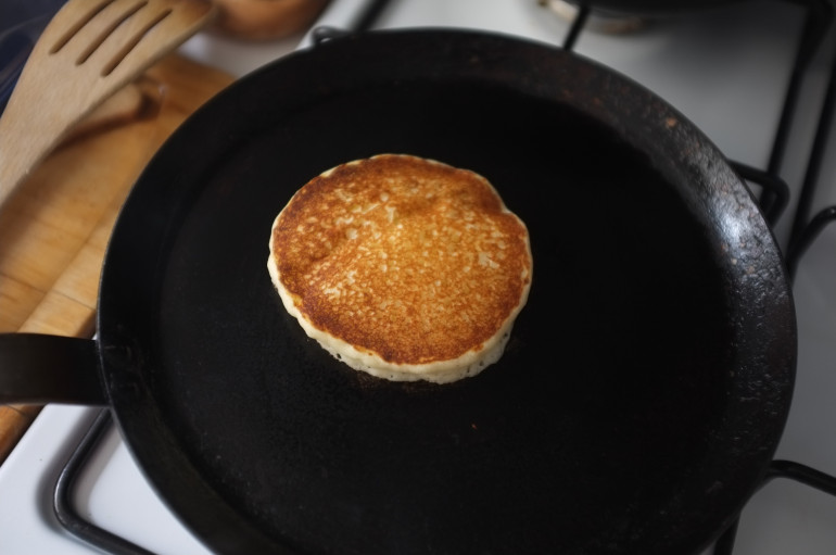 - Cuire les pancakes environ 2 à 3 minutes sur chaque face. Pour savoir quand retourner le pancake, observer les petites bulles qui apparaissent à la surface de la pâte : dès qu’elles apparaissent et que les bords commencent à être cuits, c’est le moment de le retourner.