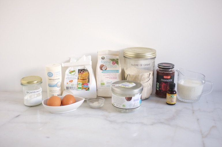 Les ingrédients pour les muffins coco fourrés à la framboise sans gluten et sans lactose