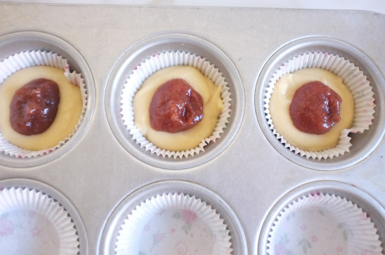 - Déposer un fond de pâte dans les petits moules en papier. Déposer au centre un peu de purée de framboise puis recouvrir avec la pâte.