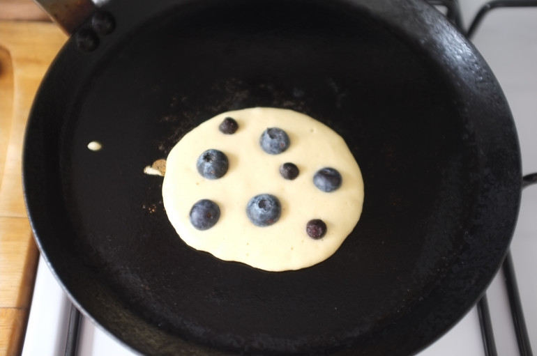 - Dans la poêle, mettre une grosse cuillère à soupe de pâte, l’étaler légèrement avec le dos de la cuillère. Déposer les myrtilles sur la pâte, cuire jusqu’à ce que des petites bulles apparaissent à la surface. C’est le signe qu’il faut retourner le pancake. Cuire pour obtenir une couleur dorée pour chaque face.