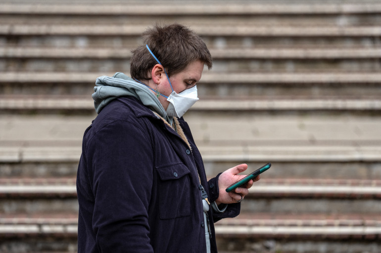 Une personne portant un masque fait la queue pour recevoir des antibiotiques à l'Université du Kent à Canterbury