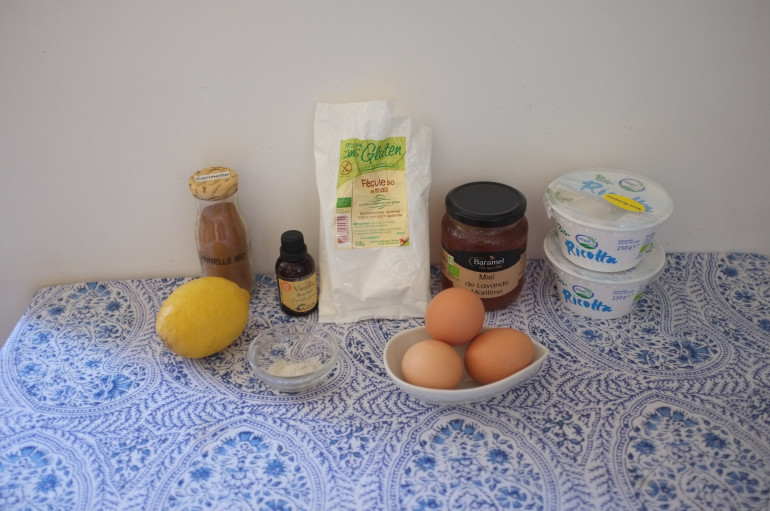 - Dans un large saladier, verser la ricotta. Battre un instant, au batteur à main électrique, pour l’assouplir, puis verser dans cet ordre : 100 ml de miel, les œufs, la fécule, la vanille, le sel et le zeste de citron, en mélangeant très légèrement au batteur pour intégrer chaque ingrédient.