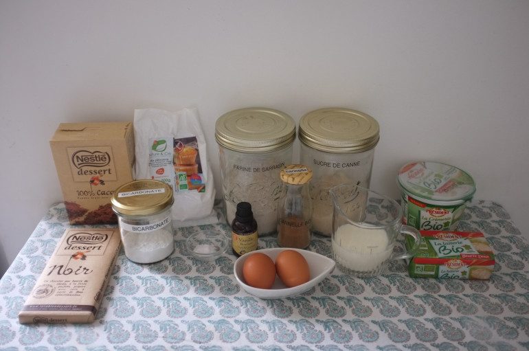 - 100 g de mix pâtisserie sans gluten (composé de 50 g de farine de sarrasin, 45 g de cacao noir en poudre, 1 cuillère à café de bicarbonate, ½ cuillère à café de sel fin, ½ cuillère à café de cannelle en poudre)
