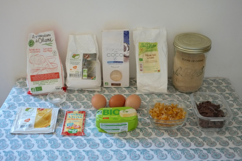 La farine de millet, ici choisie pour cette recette, est riche en magnésium, phosphore, zinc et en vitamines A. Elle possède un délicat goût de noisette qui renforce la saveur de l’amande. La farine de coco est la farine la plus riche en fibres : entre 45g et 60g pour 100g de farine. Très riche en sélénium, en antioxydants, son indice glycémique est faible de 35, ce qui la rend favorite pour les personnes diabétiques. L’orange confite et le chocolat noir apporte une saveur de noir, et ce dernier est très riche en magnésium et antioxydant.