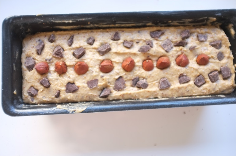 - Garder un peu d’éclats de chocolats pour la décoration du cake et verser dans la pâte le reste des éclats. La pâte est alors souple et sent bon la noisette.