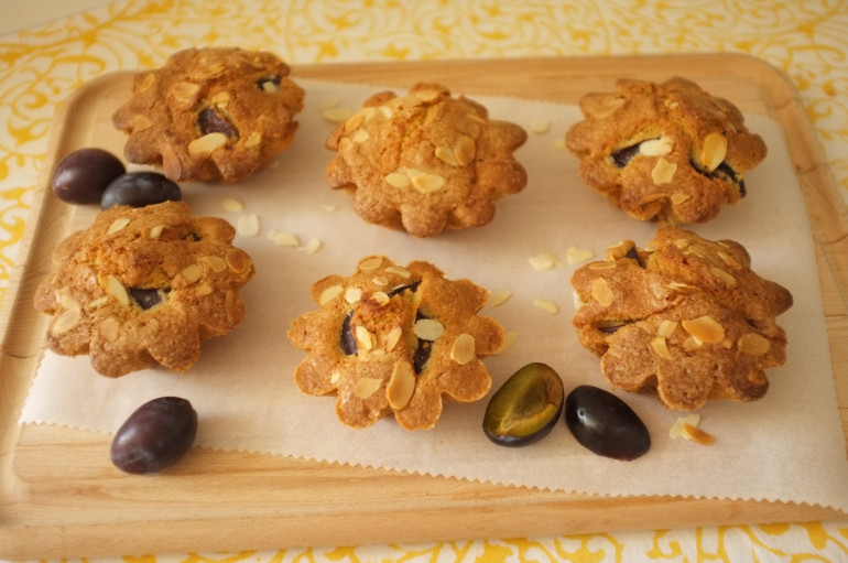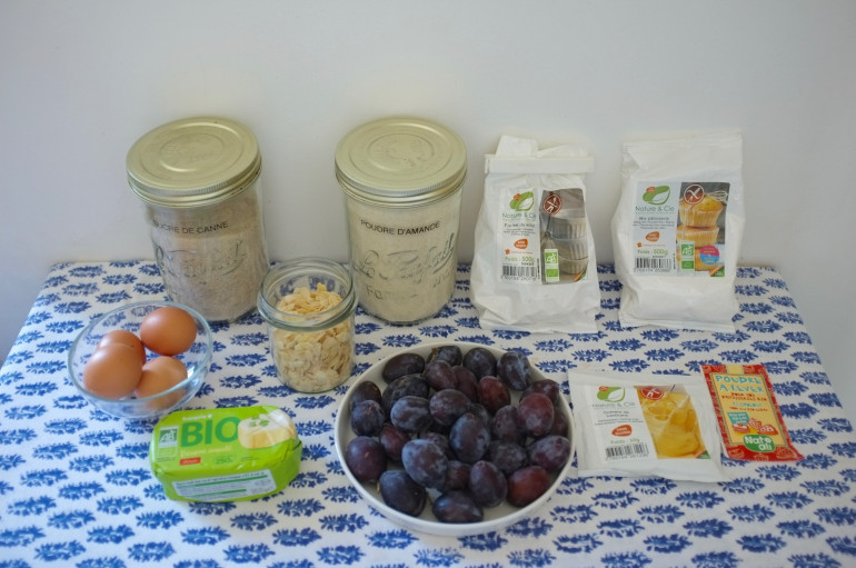 Pour cette recette sans gluten, l'utilisation d'un mix pâtisserie sans additif simplifie le mélange et le dosage de la farine de riz et de la fécule de pomme de terre; mais ce mélange neutre se doit d'être alors complété par de la poudre d'amande et de la farine de millet pour apporter les qualités nutritives nécessaires au bien-être et une belle couleur de pâte. En effet, la poudre d'amande est riche en protéines, en minéraux comme le manganèse, le cuivre, zinc et fer, en vitamines B1, B2, B3, B9 et vitamine E, en fibres et aide fortement au sentiment de satiété. Par l'huile naturelle qu'elle possède, elle permet également de réduire la dose de matière grasse dans cette recette. La farine de millet est, elle, très riche en vitamine A, en phosphore, magnésium et zinc. Elle apporte un délicieux goût de noisette qui renforce le parfum des prunes et donne à ces petits gâteaux une belle couleur dorée.