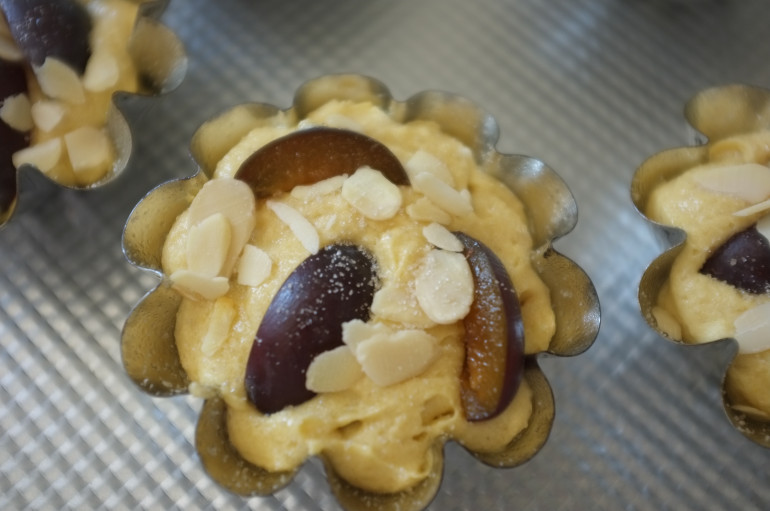 Laver, sécher et couper chaque prune en quatre quartiers et retirer le noyau. Réserver 24 petits quarts de prunes, qui seront utilisés par 3 pour décorer le dessus de chaque gâteau. Couper le reste des quartiers en petits morceaux. Verser la pâte dans les petits moules, glisser à l’intérieur de la pâte des petits morceaux de prunes. Lisser le dessus de la pâte et décorer avec 3 quartiers de prunes, saupoudrer d’amandes effilées. Vous pouvez également saupoudrer un peu de sucre de canne sur les fruits.