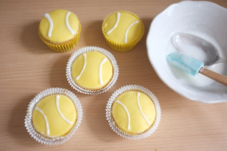 Préparer le glaçage royal : mettre dans un bol le blanc d’œuf, ajouter le jus de citron frais. Mélanger un peu avec une spatule. Verser le sucre glace et mélanger toujours avec la spatule (ne surtout pas utiliser un fouet pour le glaçage royal, mais uniquement une spatule) pour intégrer le sucre et obtenir une bonne texture, légèrement épaisse. Verser dans un petite poche à pâtisserie ou utiliser simplement un pinceau à pâtisserie pour dessiner les marque blanches de la balle de tennis.