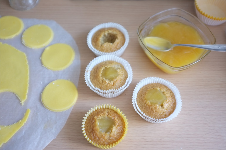 Creuser au centre de chaque cupcake, encore un peu tiède, une mini cavité. Garnir de lemon curd et recouvrir le dessus également d’une fine couche, cela permet ensuite de coller dessus la pâte à sucre jaune. Décorer ainsi tous les cupcakes.