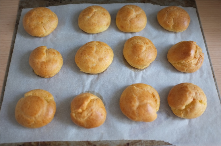 Cuire 15mn à 205°C puis baisser la température à 175°C pendant encore 15 minutes. Laisser refroidir les choux devant la porte du four ouverte, afin que le changement de température ne les face pas dégonfler. Ensuite, déposer les petits choux sur une grille pour qu’ils refroidissent complètement.