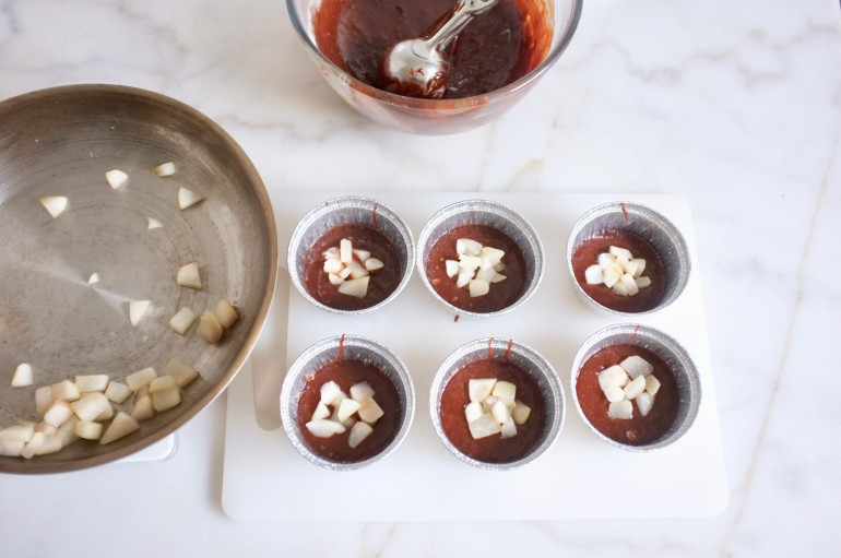 Des petits morceaux de poires, riches en fibres, apportent une texture au cœur fondant de ces petits desserts.