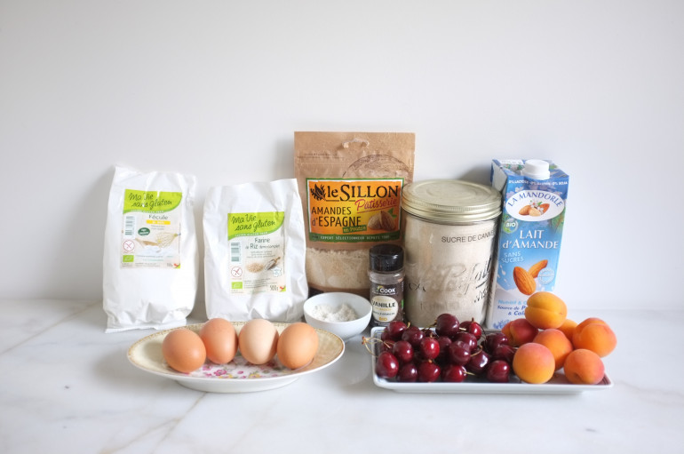 Les ingrédients sans gluten et sans lactose pour le clafoutis abricot cerise.