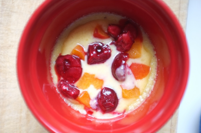 5- Sortir le(s) moule(s) du four. Déposer les petits morceaux de fruits coupés sur le fond de pâte. Déposer sur les fruits un oreillon d’abricot au centre du ramequin et recouvrir du reste de la préparation à clafoutis
