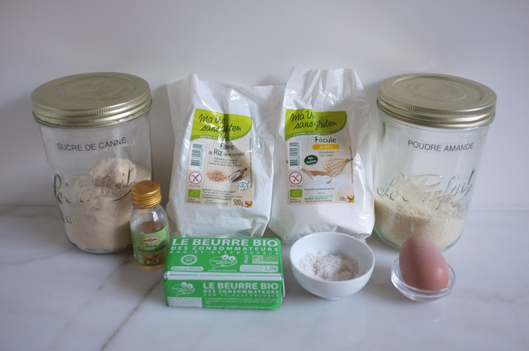C'est la poudre d'amande qui apporte à la pâte sans gluten cette belle couleur jaune pâle. L'extrait d'amande amère enrichit la saveur de la poudre d'amande. La farine de riz est de saveur neutre et la fécule est indispensable pour l’adoucir.