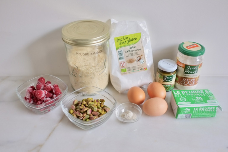 Les ingrédients pour la recette des financiers framboise-pistache sans gluten