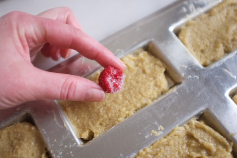 Pour cette recette, les framboises ont été sélectionnées en amont : un petit "casting" de 12 framboises bien dodues, replacées dans le congélateur pendant toute la durée de préparation de la recette et ressorties du froid vraiment juste au moment de les placer et d’enfourner les financiers.