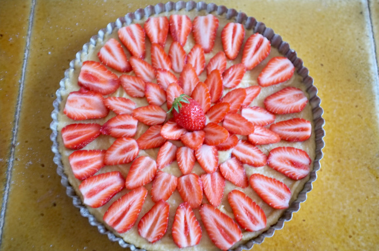 - Décorer avec les fraises, et cuire 50 minutes selon le four, en faisant deux rotations du moule pendant la cuisson pour assurer une couleur dorée uniforme. Au bout de 40 minutes, vous pouvez, si le gâteau est déjà bien doré, protéger le dessus d’une feuille d’aluminium ou de papier cuisson et continuer la cuisson.