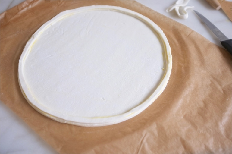 3. Déroulez délicatement la première pâte, tout en la laissant sur son papier cuisson. Poser dessus un cercle d’un diamètre légèrement inférieur : utiliser le fond en métal d’un moule à tarte, un saladier retourné... Découper les bords en gardant précieusement les chutes de pâtes dans cette forme arrondie.
