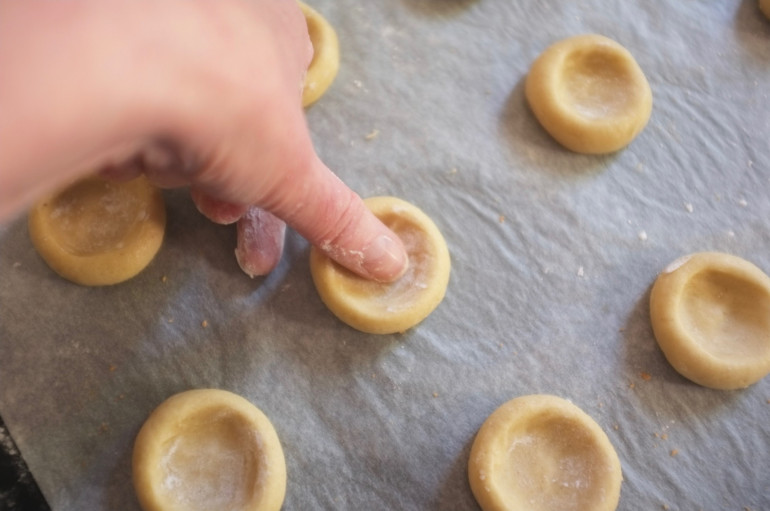 8 - Déposer dans la petite cavité la confiture de votre choix. Espacer chaque biscuit de quelques centimètres sur la plaque de cuisson.