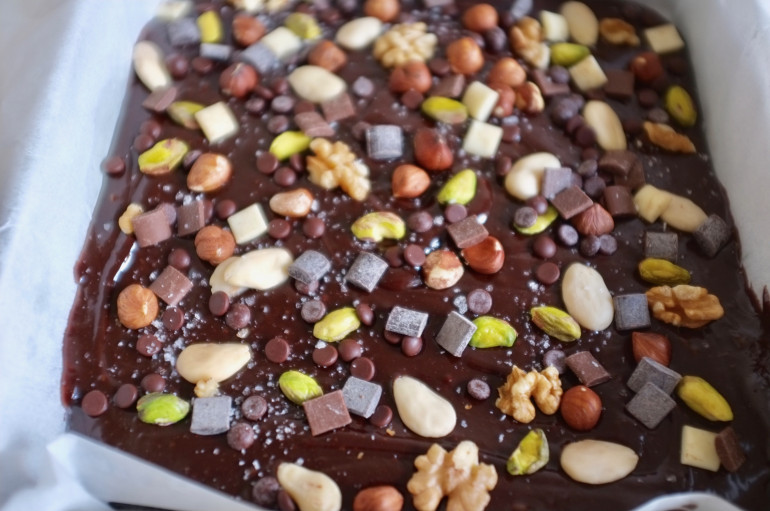 - Verser dans le moule en lissant éventuellement. Décorer avec les fruits secs, les pépites de chocolats de différentes tailles et saupoudrer le tout de fleurs de sel.