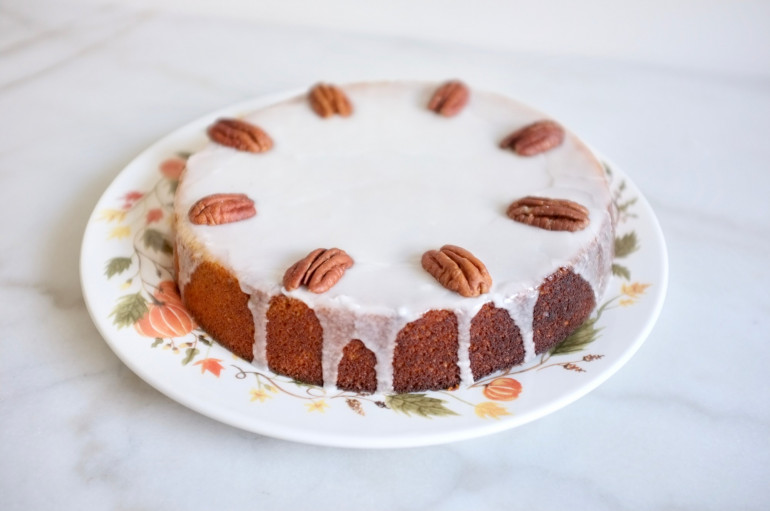 9. Un fois le gâteau complètement froid, préparer le glaçage en mélangeant le sucre glace et le jus de citron, et décorer le gâteau. Laisser sécher le glaçage et déguster.