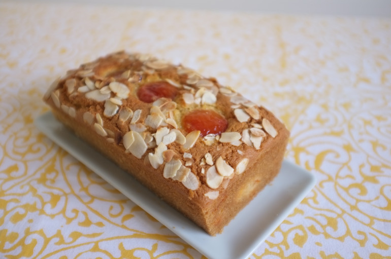 Avant d'être enfourné, le cake est décoré d'oreillons d'abricots et saupoudré d'amande effilées