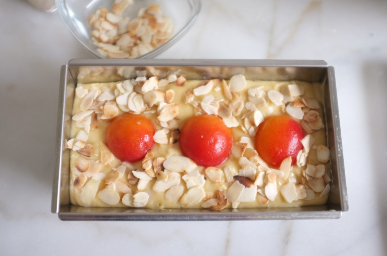 - Verser dans le moule à cake préalablement huilé. Décorer le dessus avec les trois oreillons d’abricot et saupoudrer avec les amandes effilées.