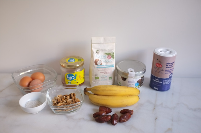 - Dans le bol du mixeur avec lame acier (ou blender) mélanger les bananes, les œufs, l’huile et les dates jusqu’à ce que tous les ingrédients soient bien mixés (la texture est plutôt liquide). Verser alors le mélange des ingrédients secs (la pâte s’épaissit alors avec la farine de coco) puis ajouter en dernier les noix.