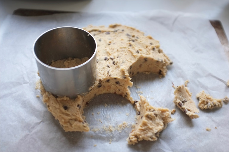 - Découper dans la pâte, à l’aide d’un emporté pièce rond (7 cm de diamètre) des parts pour découper les scones.